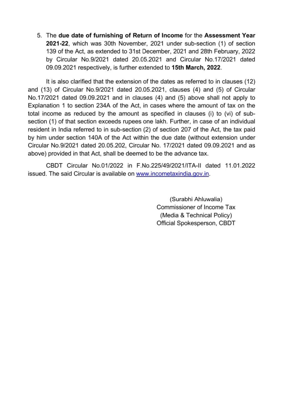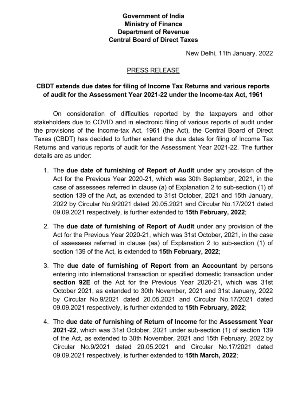 On consideration of difficulties reported by taxpayers/stakeholders due to Covid & in e-filing of Audit reports for AY 2021-22 under the IT Act, 1961, CBDT further extends due dates for filing of Audit reports & ITRs for AY 21-22. Circular No. 01/2022 dated 11.01.2022 issued. pic.twitter.com/2Ggata8Bq3