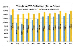 लेटेस्ट सरकारी आंकड़ों ने मुताबिक बीते महीने कुल 1,60,122 करोड़ रुपये का जीएसटी कलेक्शन हुआ है। वित्तवर्ष 2022-23 में कुल जीएसटी संग्रह 18.10 लाख करोड़ रुपये रहा है। जो वित्तवर्ष 2021-22 के मुकाबले 22% ज्यादा है। खास बात यह है कि बीते वित्तवर्ष के चार महीने ऐसे रहे जब कुल जीएसटी कलेक्शन 1.5 लाख रुपये से ऊपर ही रहा। वित्त वर्ष 2021-22 के मार्च महीने में जीएसटी कलेक्शन 1,42,095 करोड़ था। वहीं फरवरी 2023 मे टैक्स संग्रह 1,49, 577 करोड़ था।