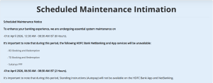 1 अप्रैल 12:30 AM से लेकर 8:30 AM तक पूरे 8 घंटे ग्राहकों को एचडीएफसी बैंक नेट बैंकिंग और ऐप सर्विस से संबंधित कुछ सेवाओं का लाभ नहीं मिलेगा। इस दौरान खाताधारक रेकरिंग डिपॉजिट बुकिंग या रिडेंप्शन नहीं कर पाएंगे। न ही टाइम डिपॉजिट बुकिंग और रिडेंप्शन की सुविधा मिलेगी। सुकन्या पीपीएफ की सर्विस भी अनुपलब्ध रहेगी।