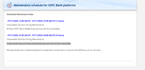 7 नवंबर को 12:00 AM से लेकर 1:00 AM तक पूरे 1 घंटे सभी नए एचडीएफसी बैंक नेट बैंकिंग सर्विस बंद हगी। कस्टमर कस्टमर इस दौरान नेट बैंकिंग के जरिए लेनदेन नहीं कर पाएंगे वहीं। इस दिन 1:00 AM लेकर 4 AM तक पूरे 3 घंटे डेबिट कार्ड व्यू और डाउनलोड स्टेटमेंट की सर्विस बंद रहेगी। ग्राहक बैंक के ऐप, वेबसाइट और नेट बैंकिंग पोर्टल पर क्रेडिट मंथली क्रेडिट कार्ड बिल या स्टेटमेंट को ऑनलाइन चेक नहीं कर पाएंगे। न ही इसका पीडीएफ या डिजिटल कॉपी डाउनलोड कर पाएंगे। निर्धारित समय सीमा के बाद सेवाएं फिर से पहले की तरह उपलब्ध हो जाएगी।