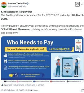 आयकर विभाग ने कहा कि, “समय पर भुगतान करने से कर कानून का अनुपालन सुनिश्चित होता है और विकसित भारत आंदोलन को समर्थन मिलता है। इससे भारत आत्मनिर्भरता और समृद्धि की ओर बढ़ता है।”