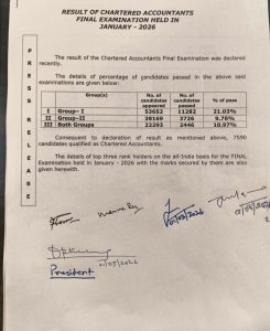 इंस्टिट्यूट ऑफ़ चार्टर्ड अकाउंटेंट्स ऑफ़ इंडिया ने सीए फाइनल जनवरी 2026 परीक्षा (ICAI CA Exam 2026) का परिणाम 1 मार्च 2026 को जारी कर दिया है। उम्मीदवार आधिकारिक वेबसाइट http://www.icai.org या https://icai.nic.in/caresult/final/ पर जाकर अपना स्कोरकार्ड डाउनलोड कर सकते हैं। इसके लिए 6 डिजिटल रोल नंबर और रजिस्ट्रेशन नंबर की जरूरत पड़ेगी।