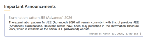 आईआईटी रुड़की ने जेईई एडवांस्ड 2026 पैटर्न (JEE Advanced 2026) ने संबंधित अफवाहों का खंडन किया है। इस बार इस पैटर्न में कोई भी बदलाव नहीं होगा। कुछ रिपोर्ट्स ज्वाइंट एंट्रेंस एग्जामिनेशन-एडवांस्ड के लिए एडैप्टिव टेस्टिंग फॉर्मेट लागू होने का दावा किया कर रहे थे। अब आईआईटी रुड़की ने यह कंफर्म कर दिया है कि परीक्षा पैटर्न पिछले सेशन के समान होगा। जरूरी जानकारी इंफॉर्मेशन ब्रोशर में दी गई है