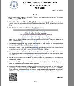 नीत पीजी उम्मीदवारों के लिए बड़ी अपडेट सामने आई है। नेशनल बोर्ड ऑफ एग्जामिनेशन इन मेडिकल साइंसेज (एनबीईएमएस) ने 10 जुलाई को महत्वपूर्ण नोटिस जारी किया है। जिसमें उम्मीदवारों को फर्जी नोटिस, एसएमएस और ईमेल से बचकर रहने की सलाह दी गयी है। NBEMS ने कहा, “बेईमान एजेंट या दलाल फर्जी नोटिस का इस्तेमाल करके उम्मीदवारों से झूठ और फर्जी दावे कर सकते हैं। एनबीईएमएस के नाम का इस्तेमाल सोशल मीडिया/ईमेल/एसएमएस पर फिशिंग के लिए कर सकते हैं।”