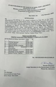 छत्तीसगढ़ राज्य प्रशासनिक सेवा (राप्रसे) के 7 अफसरों को भारतीय प्रशासनिक सेवा (IAS) में प्रमोट किया गया है। यह नियुक्ति वर्ष 2024 की चयन सूची (Select List 2024) के तहत की गई है। केंद्र सरकार के कार्मिक एवं प्रशिक्षण विभाग (डीओपीटी) ने मंगलवार (17 फरवरी 2026) को इसकी अधिसूचना जारी कर दी है।