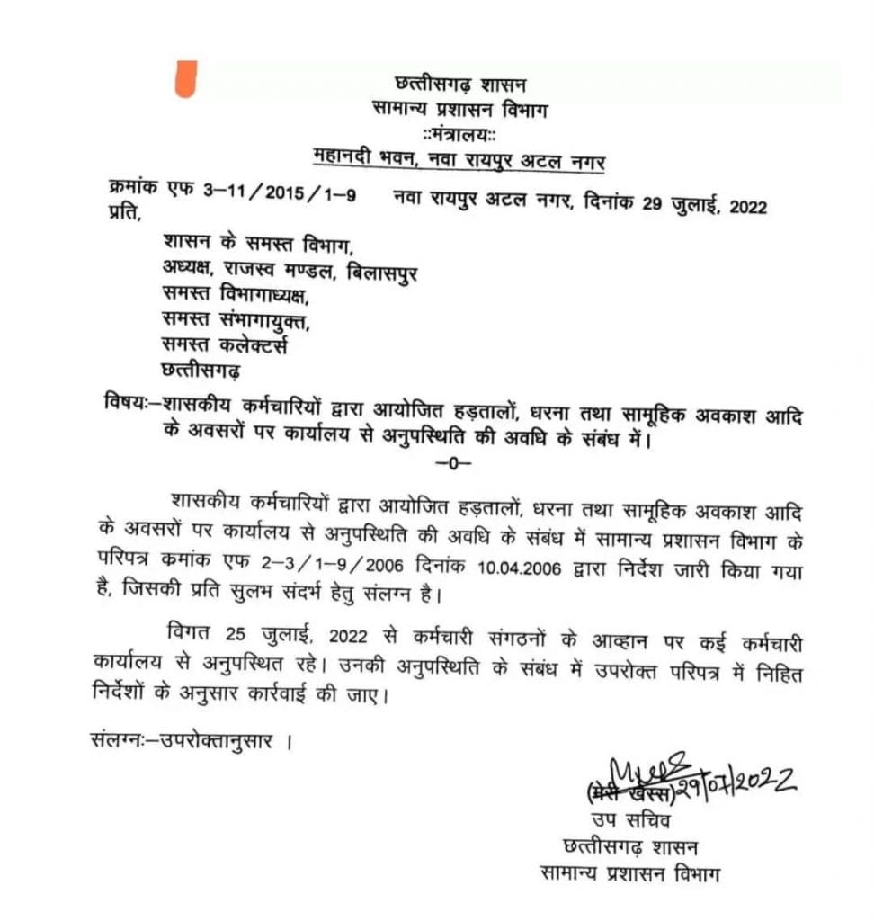 राज्य सरकार के सामान्य प्रशासन विभाग ने प्रदेश के 5 लाख हड़ताली अधिकारी-कर्मचारियों को 2006 का एक आदेश याद दिलाया है।महानदी भवन मंत्रालय के सामान्य प्रशासन विभाग के उप सचिव मेरी खेस्स ने एक ताजा आदेश जारी कर कहा है कि 10 अप्रैल 2006 को परिपत्र जारी किया गया था, उसके तहत दिए गए निर्देशों के अनुसार हड़ताली कर्मचारियों पर कार्रवाई की जाएगी।