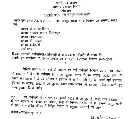 सामान्य प्रशासन विभाग द्वारा सभी विभागाध्यक्षों एवं कलेक्टर्स को निर्देश जारी कर कहा गया है कि विभिन्न कर्मचारी संगठनों के आव्हान पर जो कर्मचारी विगत 25 जुलाई से 29 जुलाई 2022 तक की अवधि में हड़ताल में थे एवं वर्तमान में हड़ताल में शामिल नहीं हुए हैं, उन्हें 25 जुलाई से 29 जुलाई 2022 तक हड़ताल अवधि को अवकाश स्वीकृत करते हुए वेतन भुगतान किया जाए।
