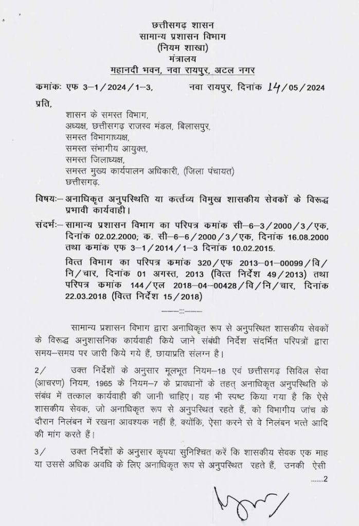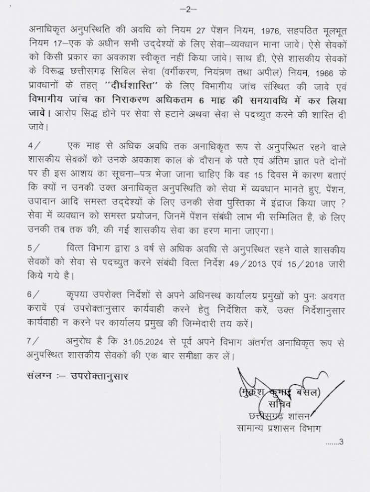आदेश के तहत, एक माह या उससे से अधिक समय के लिए अगर कोई शासकीय कर्मचारी अनाधिकृत रूप से अनुपस्थित रहता हैं, तो उसे निलंबित करने की जगह पर आरोप सिद्ध होने पर उन्हें सेवा से हटाने के साथ ही बर्खास्त कर दिया जाएगा। अनाधिकृत रूप से अनुपस्थिति की अवधि के सेवा और व्यवधान मानते हुए, अवकाश स्वीकृत नहीं करने और अधिकतम 6 माह के समय अवधि में निराकरण करने और विभागीय जांच को लेकर निर्देशित जारी किया हैं।