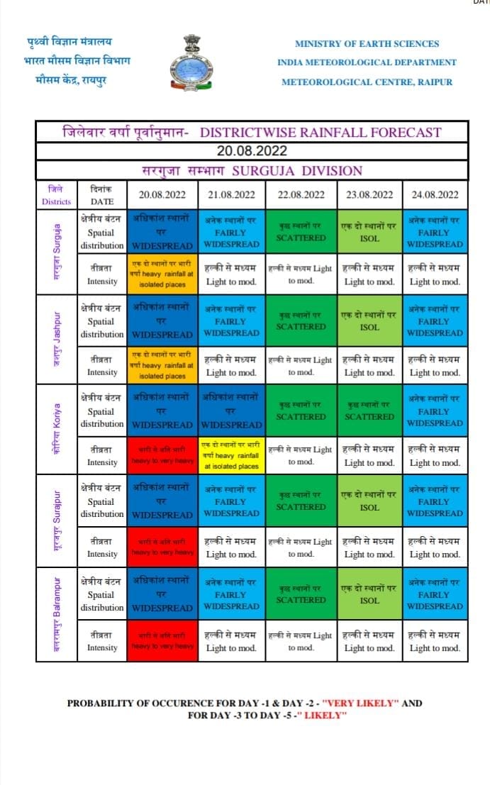 20. 21 और 22 अगस्त को छत्तीसगढ़ के कई जिले में तेज बारिश की संभावना जताई गई है। जिसमें सूरजपुर, बलरामपुर, सरगुजा, रायपुर के अलावा बलौदाबाजार और बस्तर में भारी बारिश का रेड ऑरेंज अलर्ट जारी किया गया है। मौसम विभाग ने 24 घंटे के लिए कई जिलों में ऑरेंज और येलो अलर्ट जारी करते हुए अति भारी बारिश की संभावना भी जताई है। वर्षा का मुख्य क्षेत्र उत्तर और मध्य छत्तीसगढ़ माना जा रहा है। डिप्रेशन के छत्तीसगढ़ के उत्तरी सीमा से गुजरने के बाद इन जिलों में बारिश की संभावना व्यक्त की गई है। 3 संभाग में आज भारी बारिश का अनुमान जताया गया है।
