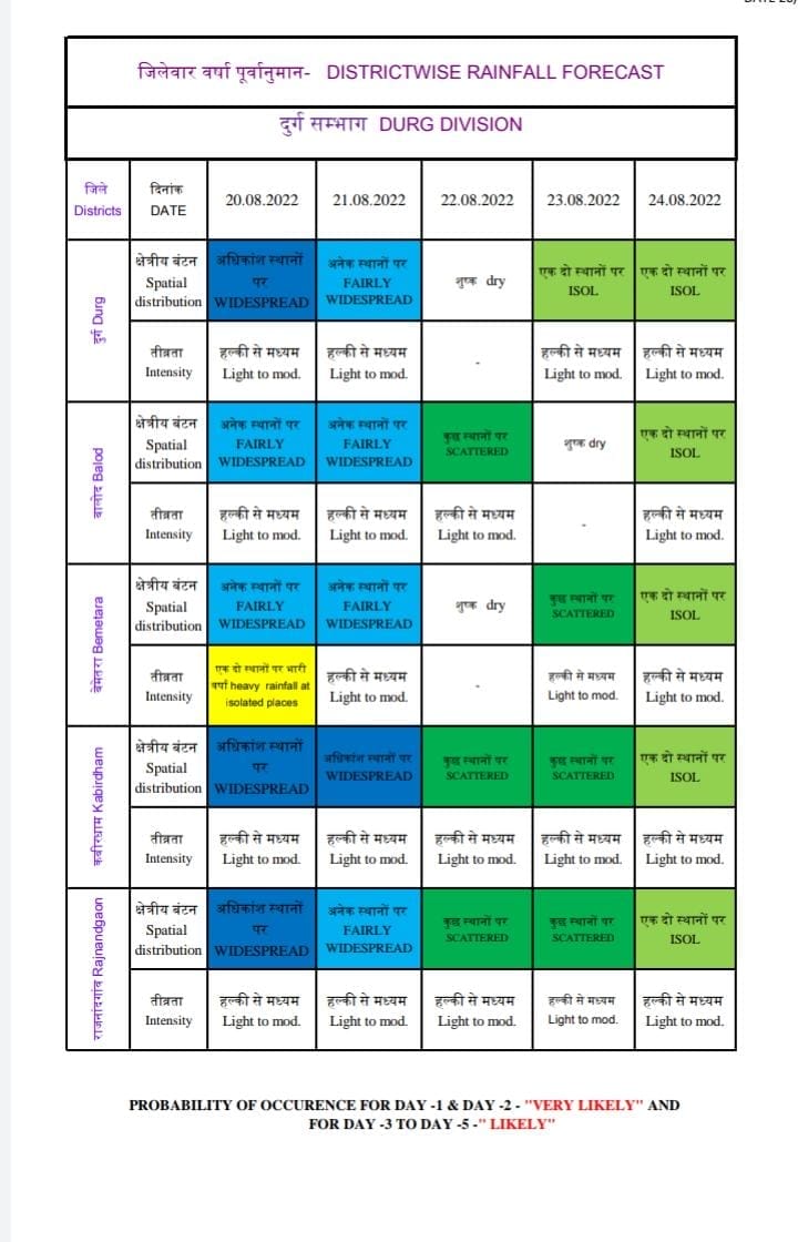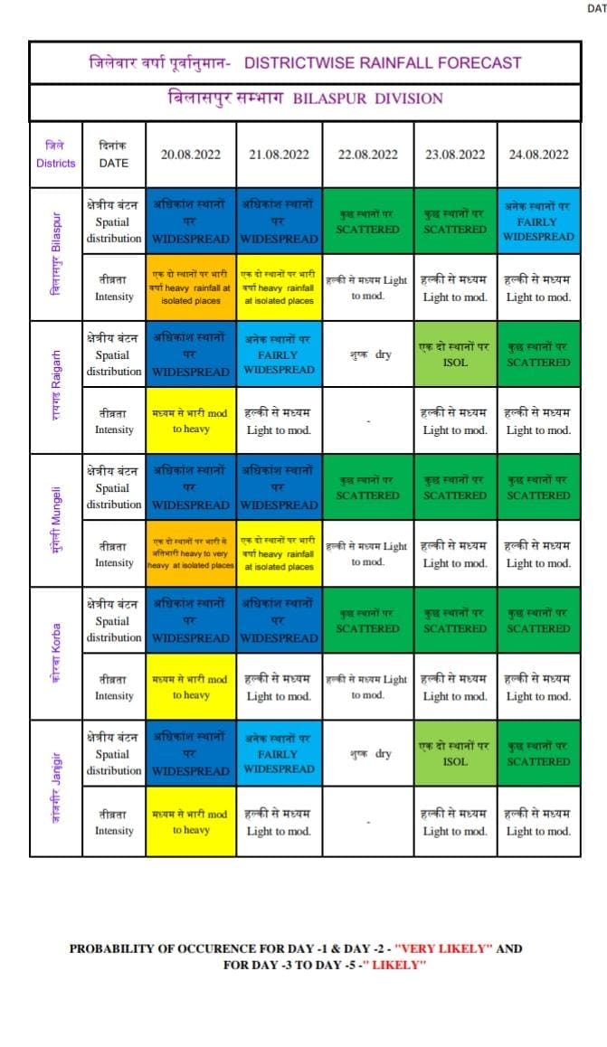 मौसम विभाग की मानें तो मानसून धोनी का कब पश्चिम चोर हिमालय की तराई में स्थित है, पूर्वी छोर गोरखपुर, गया से होते हुए दक्षिण पूर्व की और मध्य बंगाल की खाड़ी तट स्थित है। जिसके कारण 21 अगस्त को बिलासपुर दुर्ग सहित सरगुजा संभाग में भारी बारिश की चेतावनी जारी कर दी गई। इसके अलावा महानदी से गंगरेल और शिवनाथ नदी तांदुला खरखारा और मोगरा बांध से हजारों क्यूबिक पानी को छोड़ा गया है।