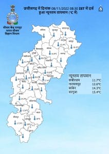 छत्तीसगढ़ मौसम वैज्ञानिक डॉ. एचपी चंद्रा ने बताया कि प्रदेश में उत्तर से शुष्क हवा का आगमन लगातार जारी है। आज 9 नवंबर को भी मौसम शुष्क बने रहने की संभावना है।बादलों के छंटते ही तापमान में उतार चढ़ाव देखने को मिलेगा और आने वाले दिनों में सर्दी बढ़ेगी। उत्तर से आने वाली हवाओं के प्रभाव से 11 नवंबर के बाद प्रदेश में न्यूनतम तापमान और गिरेगा तथा ठंड में बढ़ोतरी होगी।