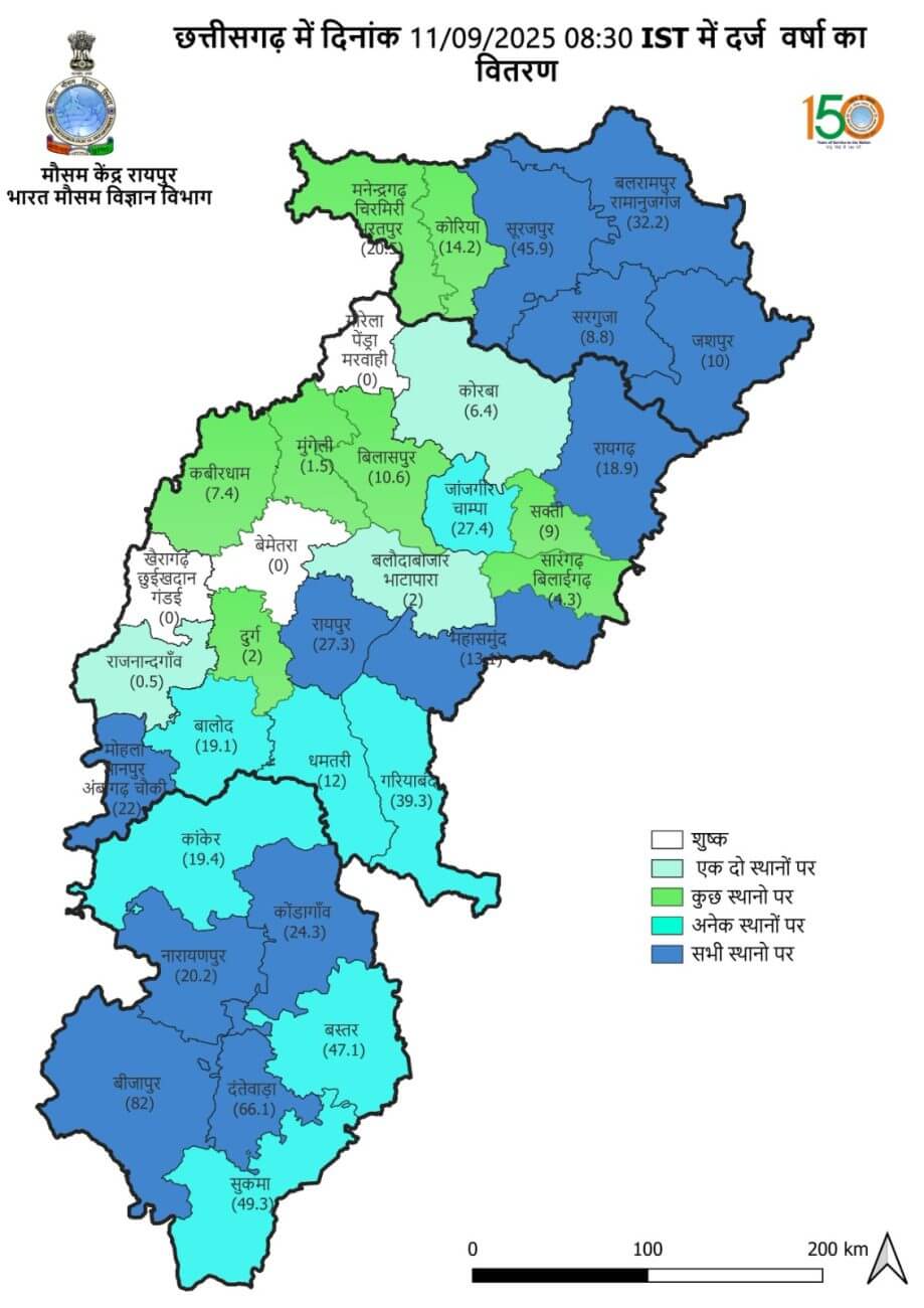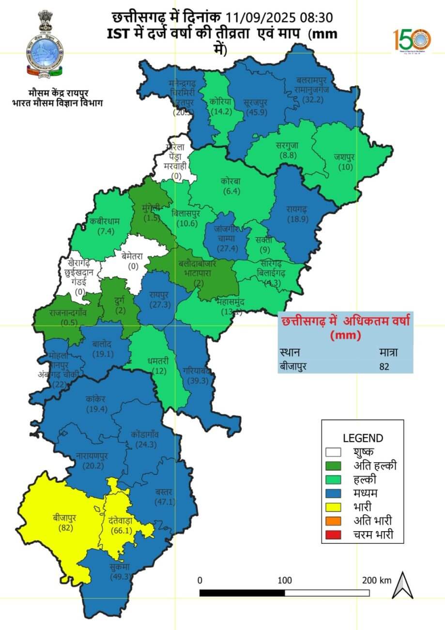 छत्तीसगढ़ में 1 जून से अब तक 978.4 मिमी औसत वर्षा रिकार्ड की जा चुकी है। बस्तर जिले में सर्वाधिक 1371.1 मिमी और बेमेतरा जिले में सबसे कम 475.1 मिमी वर्षा दर्ज हुई है।