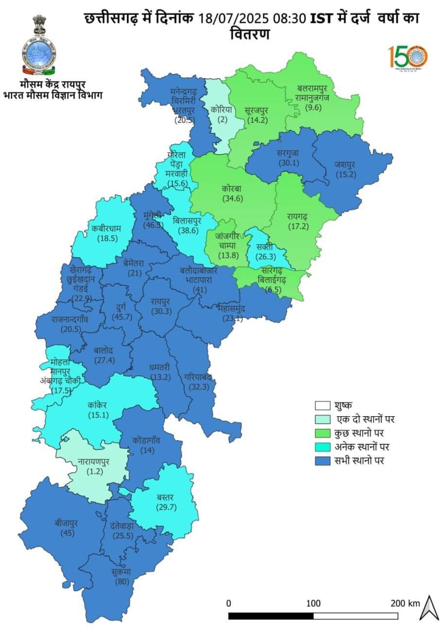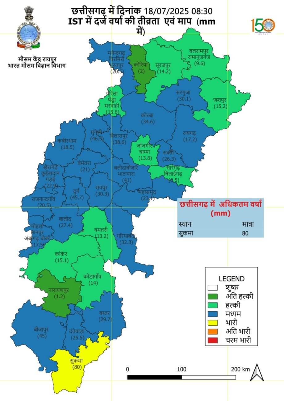 छत्तीसगढ़ में 1 जून से 18 जुलाई तक 419.2 MM वर्षा