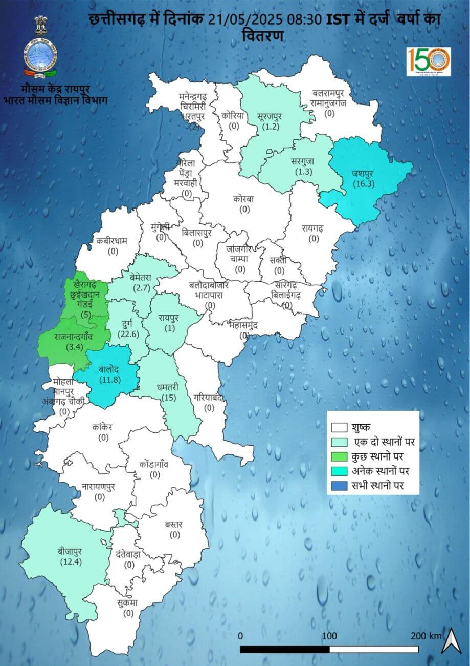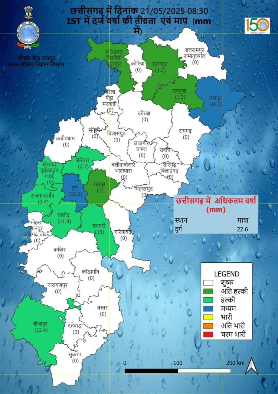 - सुकमा, बीजापुर, दक्षिण बस्तर दंतेवाड़ा, बस्तर, नारायणपुर, कोंडागांव, उत्तर बस्तर कांकेर, धमतरी, बालोद, राजनांदगांव, गरियाबंद, बिलासपुर, कोरबा, गौरेला-पेंड्रा मरवाही, बेमेतरा, कबीरधाम, मुंगेली, सुरगुजा, सूरजपुर, कोरिया, बलरामपुर, में मेघगर्जन / आकाशीय बिजली / अचानक तेज हवा (30-40 KMPH) / वर्षा की संभावना है।