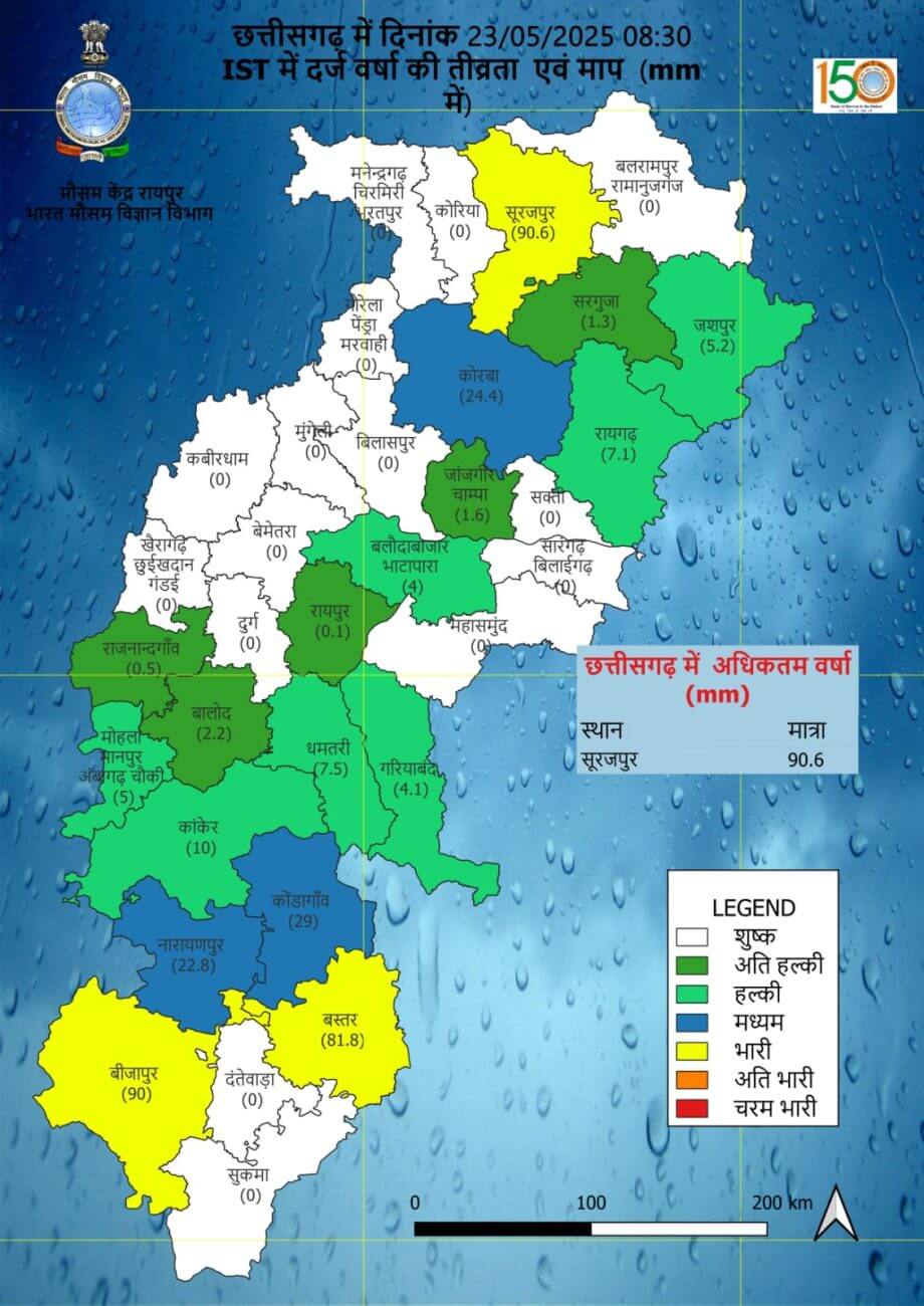 आज 23 मई को 12 जिलों में बारिश का ऑरेंज अलर्ट जारी किया गया है। रायपुर-दुर्ग में बिजली गिरने चमकने और बिलासपुर सरगुजा में अंधड़ के साथ बौछारें पड़ने का अनुमान है। रायपुर में आकाश सामान्यतः मेघमय रहने तथा गरज चमक के साथ बौछारें पड़ने की संभावना है। अधिकतम और न्यूनतम तापमान क्रमशः 34°C और 23°C के आसपास रह सकता है।