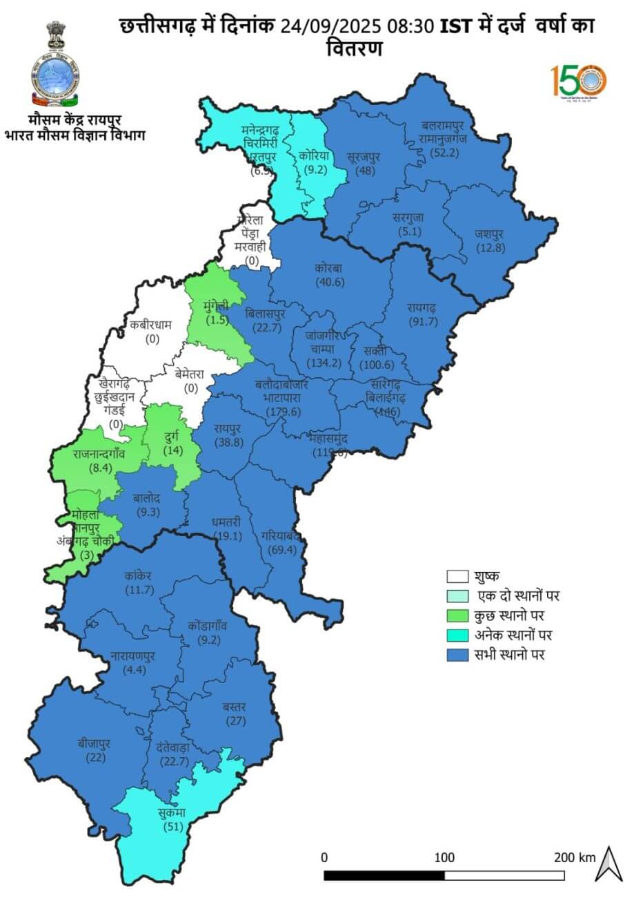 - बलौदा बाजार, महासमुंद, गरियाबंद, धमतरी, कांकेर, कोंडागांव और नारायणपुर जिले में भारी बारिश के लिए ऑरेंज अलर्ट।