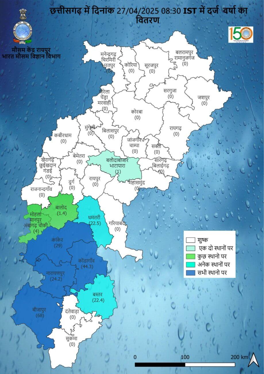 - बस्तर, बीजापुर, दंतेवाड़ा, कोंडागांव, नारायणपुर और सुकमा समेत 17 जिलों के लिए यलो अलर्ट।