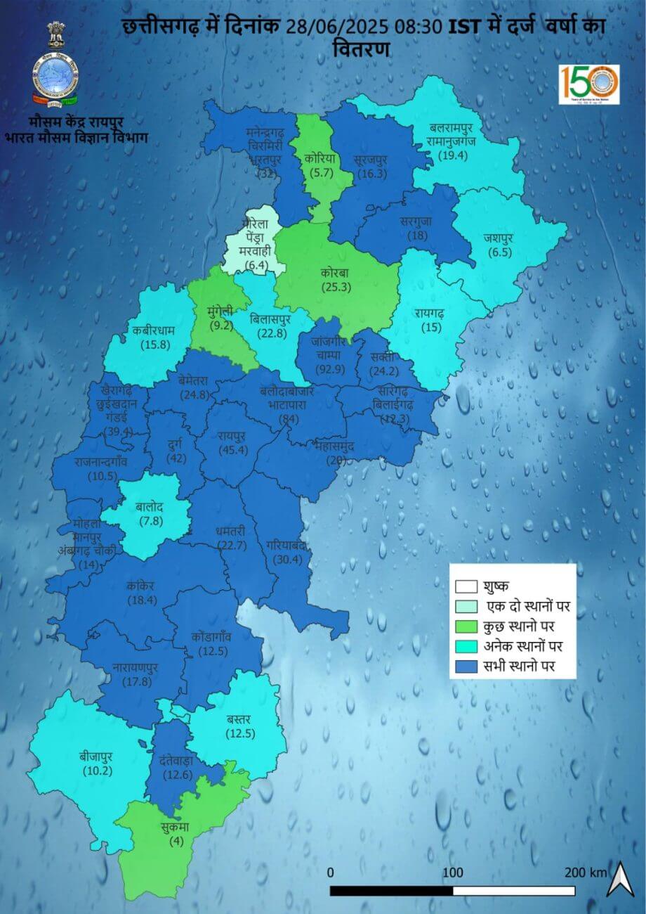 आज 28 जून को प्रदेश के 2 दर्जन जिलों में मध्यम से भारी बारिश का अलर्ट जारी किया गया है। रायपुर में आकाश सामान्यतः मेघमय रहने तथा एक-दो स्थानों पर मेघगर्जन की संभावना है। अधिकतम और न्यूनतम तापमान क्रमशः 31 डिग्री सेल्सियस और 25 डिग्री सेल्सियस के आसपास रहने की संभावना है।
