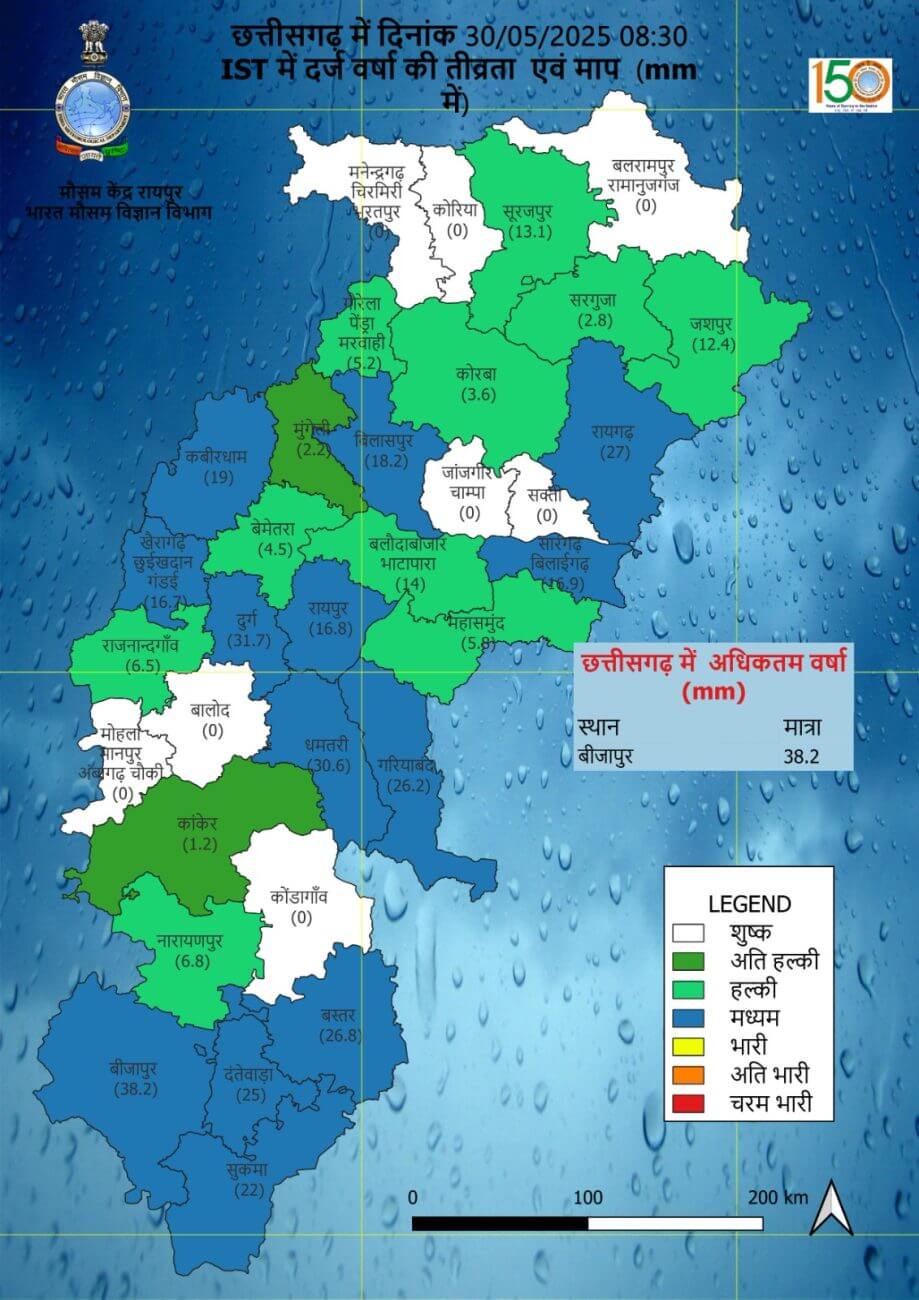 - दक्षिण-पश्चिम मानसून 29 मई 2025 को छत्तीसगढ़ के कुछ और हिस्सों में आगे बढ़ गया है।