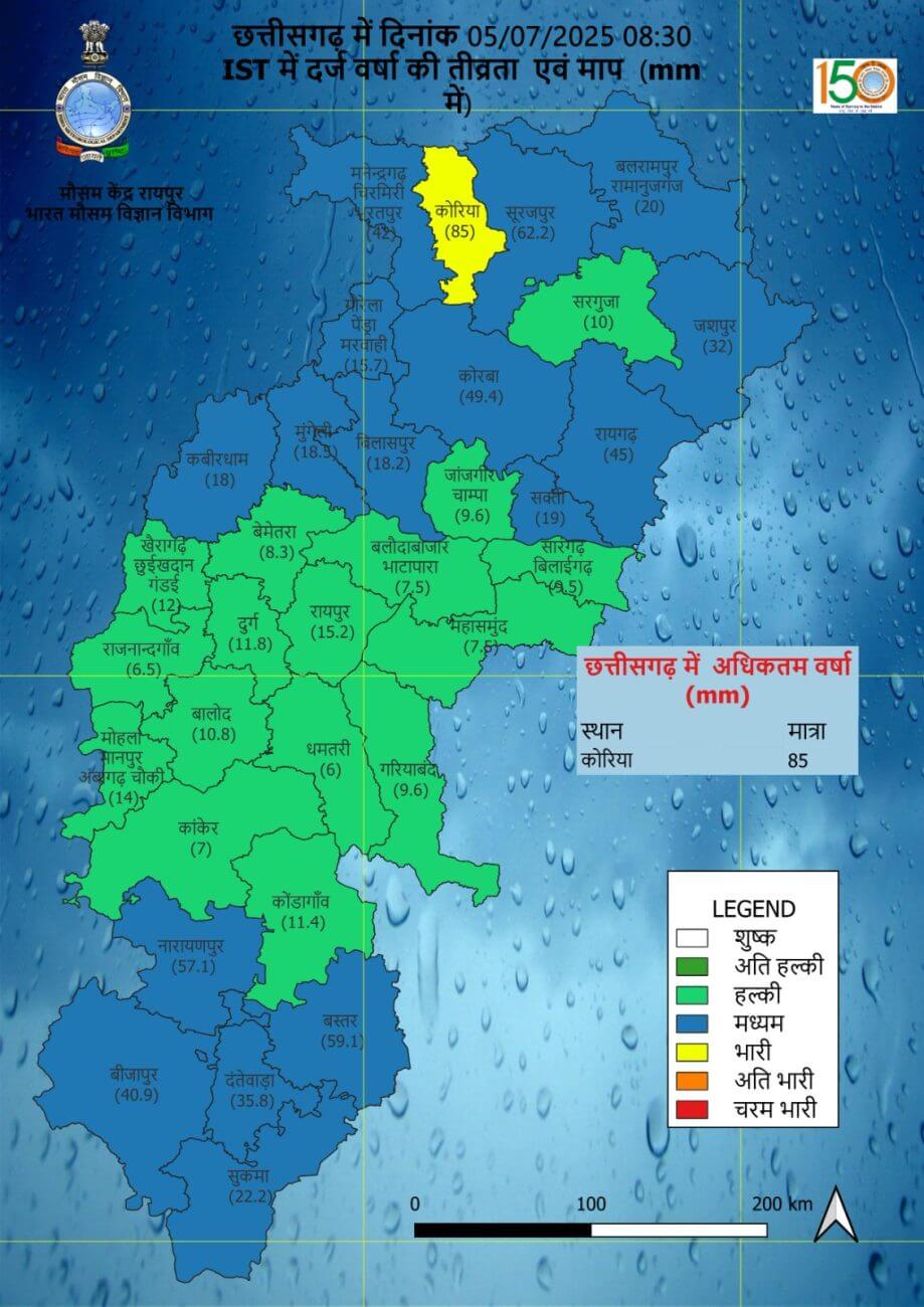 छत्तीसगढ़ में अगले 3 दिनों तक कुछ स्थानों पर भारी से अति भारी वर्षा जारी रहने की संभावना है। खास करके 6 और 7 जुलाई को वर्षा की गतिविधि में वृद्धि होने के आसार है। आज रविवार 5 जुलाई को उत्तरी छत्तीसगढ़ में तथा सोमवार 6 जुलाई को उत्तरी व मध्य छत्तीसगढ़ में वर्षा की तीव्रता अधिक होने की संभावना है।