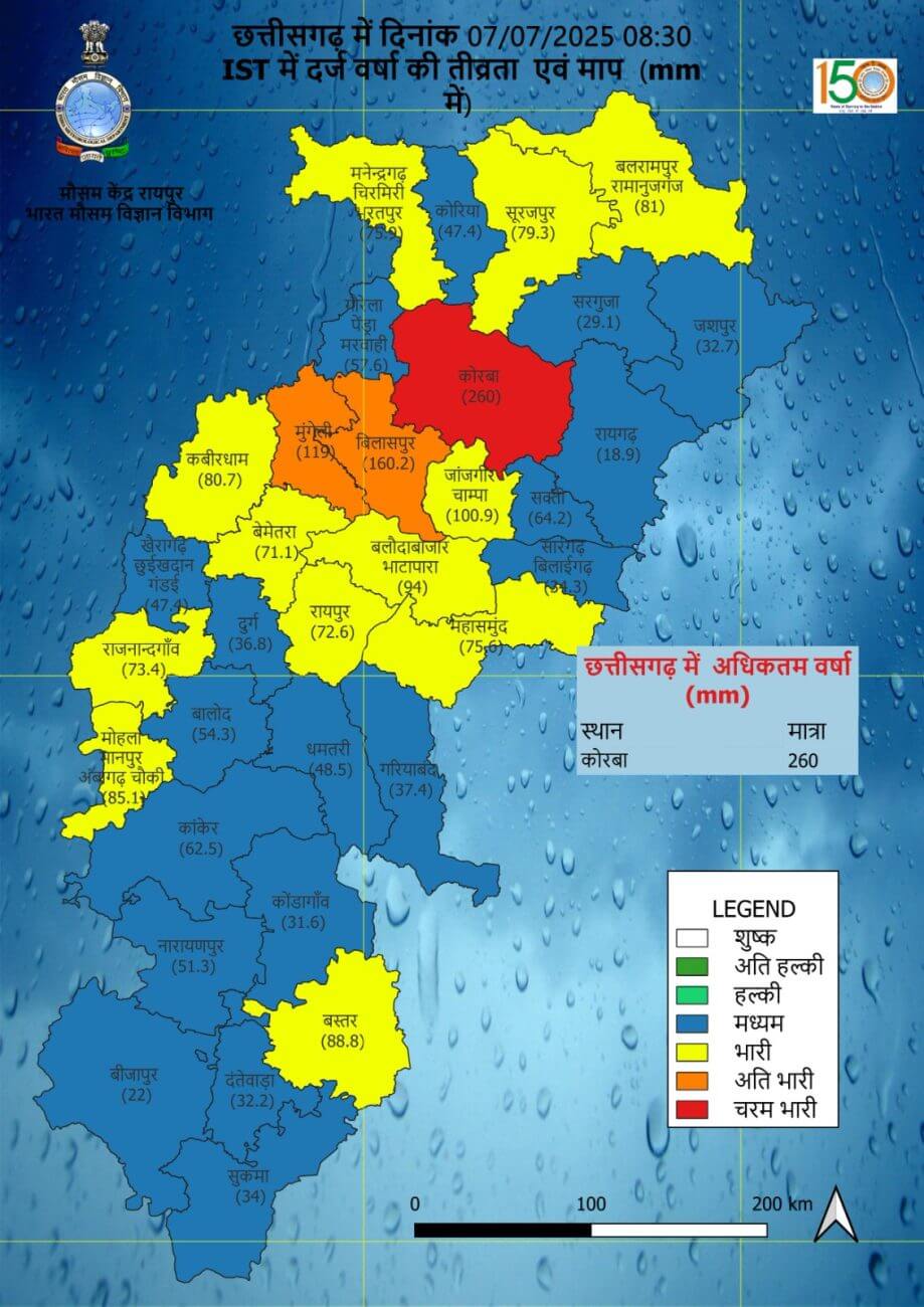 - दुर्ग जिले में 144.7 मि.मी., कबीरधाम में 195.7 मि.मी., राजनांदगांव में 140.9 मि.मी., मोहला-मानपुर-अंबागढ़ चौकी में 353.2 मि.मी., खैरागढ़-छुईखदान-गंडई में 160.8 मि.मी., बालोद में 198.9 मि.मी. और बस्तर जिले में 431.0 मि.मी. औसत वर्षा रिकार्ड हुई है।