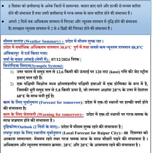 छत्तीसगढ़ मौसम विभाग की मानें तो आज रविवार 8 दिसंबर को छत्तीसगढ़ के अनेक जिलों में सामान्यतः बादल छाने, हल्की से मध्यम बारिश और उत्तरी छत्तीसगढ़ में गरज-चमक के साथ बारिश होने की संभावना है। अगले 2 दिनों तक अधिकतम तापमान में गिरावट और न्यूनतम तापमान में वृद्धि होने की संभावना है। तत्पश्चात न्यूनतम तापमान में 2 से 4 डिग्री की गिरावट होने की संभावना है।