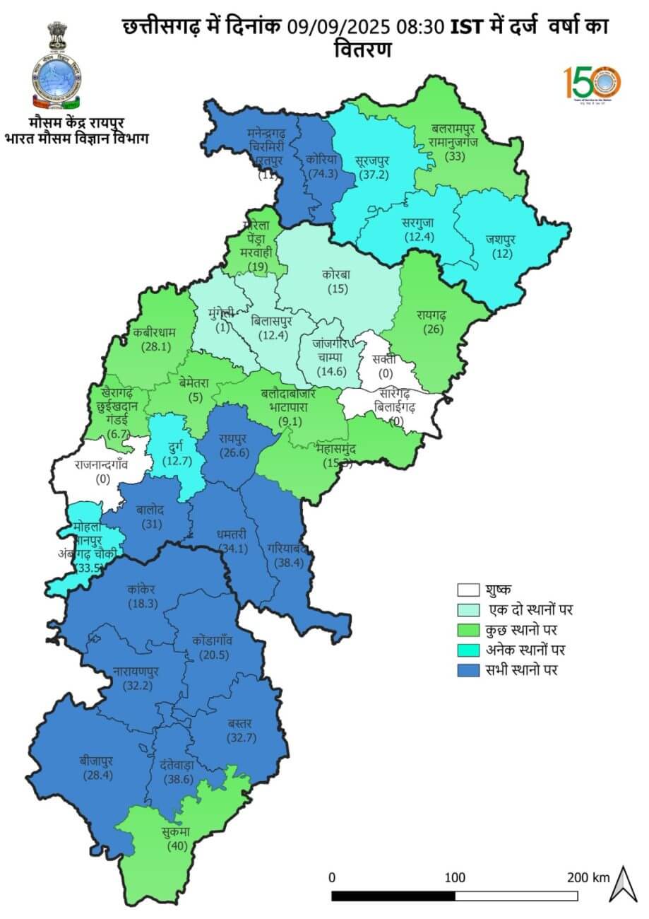 सुकमा, बीजापुर, जशपुर, कबीरधाम,सरगुजा, बलरामपुर दक्षिण बस्तर दंतेवाडा, बस्तर, नारायणपुर, बलौदा बाजार, जाजंगीर-चांपा, रायगढ़, कोंडागांव, उत्तर बस्तर कांकेर, धमतरी, बालोद, राजनांदगांव , गरियाबंद, महासमुंद, रायपुर, बिलासपुर, कोरबा, गौरेला-पेंड्रा-मरवाही, दुर्ग, बेमेतरा, मुंगेली, सूरजपुर, कोरिया में मेघगजर्गन / आकाशीय बिजली / अचानक तेज हवा (30-40 KMPH) के साथ मध्यम वर्षा है।