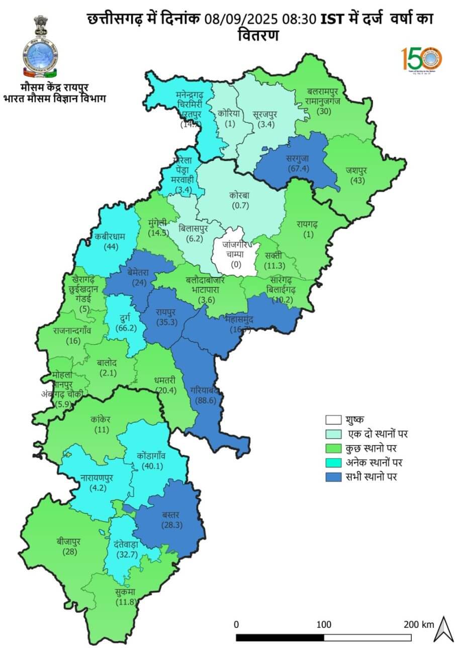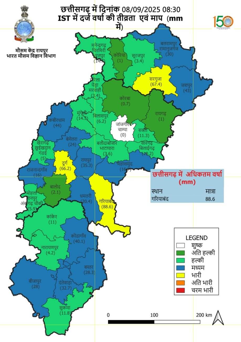 • रायपुर संभाग में रायपुर में 823.0 मि.मी., बलौदाबाजार में 704.2 मि.मी., गरियाबंद में 824.8 मि.मी., महासमुंद में 703.0 मि.मी. और धमतरी में 859.0 मि.मी. औसत वर्षा दर्ज हुई है।