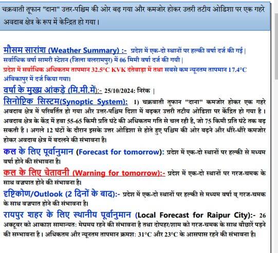 मौसम विभाग के मुताबिक, वर्तमान में तूफान “दाना” उत्तर-पश्चिम दिशा में बढ़ते हुए कमजोर पड़कर उत्तरी तटीय ओडिशा के ऊपर एक गहरे अवदाब क्षेत्र के रूप में केंद्रित हो गया है, हवा की अधिकतम गति 40-50 किलोमीटर प्रति घंटा रहने का अनुमान है ।ओडिशा से सटे छत्तीसगढ़ के उत्तरी जिलों में तूफान के कारण रात के समय अच्छी बारिश की संभावना है, जबकि हवा की गति 25 किलोमीटर प्रति घंटे तक रह सकती है। तूफान “दाना” के गुजर जाने के बाद अगले कुछ दिनों में छत्तीसगढ़ में मौसम सामान्य होने की उम्मीद है।