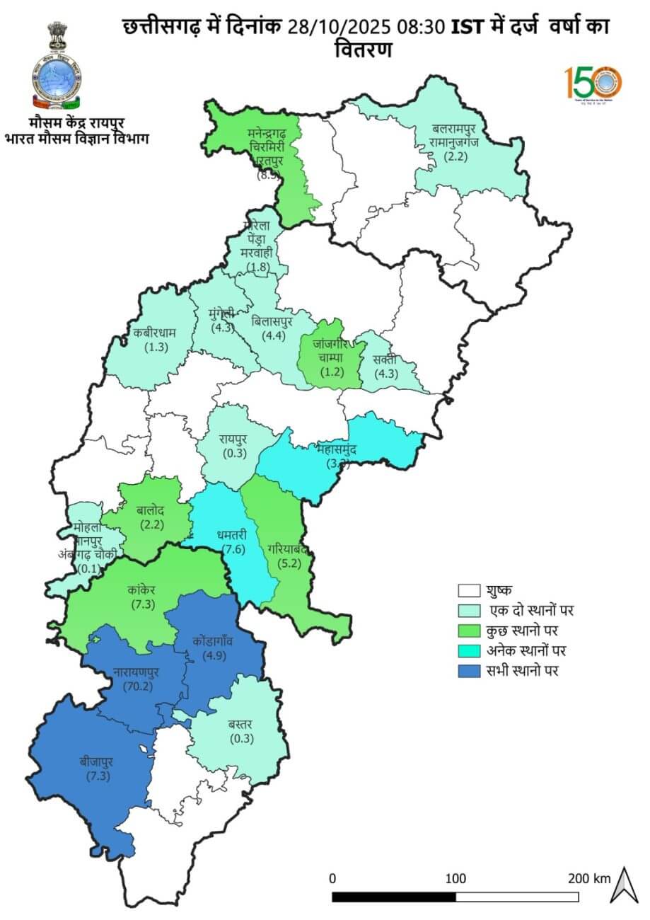 चक्रवाती तूफान “मोथा” पश्चिम मध्य बंगाल की खाड़ी के ऊपर केंद्रित है। इसके 28 अक्टूबर की सुबह तक एक गंभीर चक्रवाती तूफान में बदलने की संभावना है। आगे बढ़ते हुए, इसके 28 अक्टूबर की शाम रात को काकीनाडा के पास मछलीपट्टनमऔर कलिंगपट्टनम के बीच आध्र प्रदेश तट को एक गंभीर चक्रवाती तूफान के रूप में पार करने की बहुत अधिक संभावना है, जिसकी अधिकतम हवा की गति 90-100 किमी प्रति घंटा होगी और झोंके 110 किमी प्रति घंटा तक पहुंच सकते हैं। आज मंगलवार को दक्षिण छत्तीसगढ़ के कुछ स्थानों पर भारी से बहुत भारी बारिश और एक दो स्थानों पर अति भारी बारिश,दक्षिण छत्तीसगढ़ के जिलों में 60-70 किमी प्रति घंटे की तेज हवाएं चल सकती हैं, जो 80 किमी प्रति घंटे तक पहुँच सकती हैं। 2 दिनों के बाद मध्य और दक्षिण छत्तीसगढ़ में कुछ जगहों पर भारी से बहुत भारी बारिश के साथ दक्षिण छत्तीसगढ़ के जिलों में 50-60kmph की तेज हवाएं चलने की संभावना है।