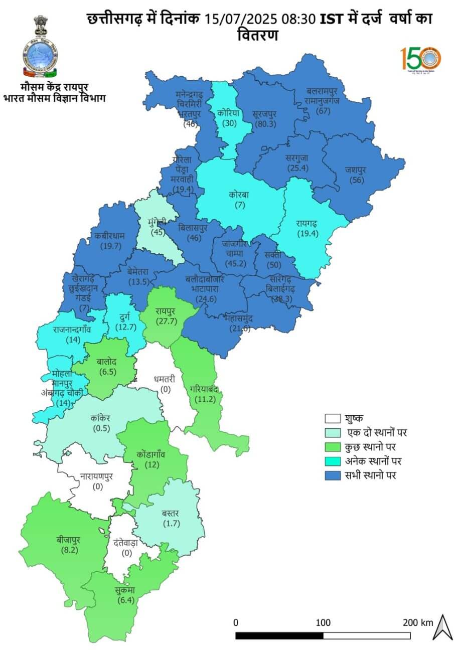 छत्तीसगढ़ में 1 जून से 15 जुलाई तक 378.2 MM वर्षा