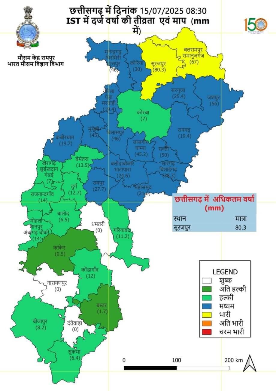 - राज्य स्तरीय बाढ़ नियंत्रण कक्ष द्वारा प्राप्त जानकारी के अनुसार सरगुजा में 292.0 मि.मी., सूरजपुर में 483.6 मि.मी., जशपुर में 507.2 मि.मी., कोरिया में 416.5 मि.मी. और मनेन्द्रगढ़-चिरमिरी-भरतपुर में 382.2 मि.मी. औसत वर्षा दर्ज हुई है।