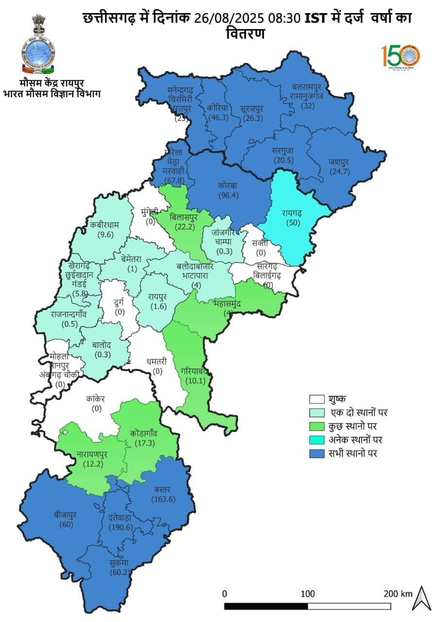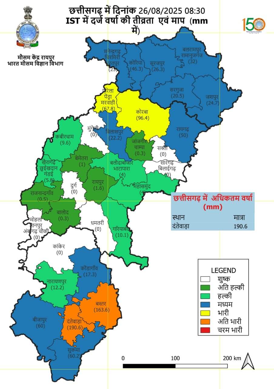 - जांजगीर-चांपा, कोरबा, रायगढ़, गरियाबंद, धमतरी, कोंडागांव, बस्तर में भारी बारिश