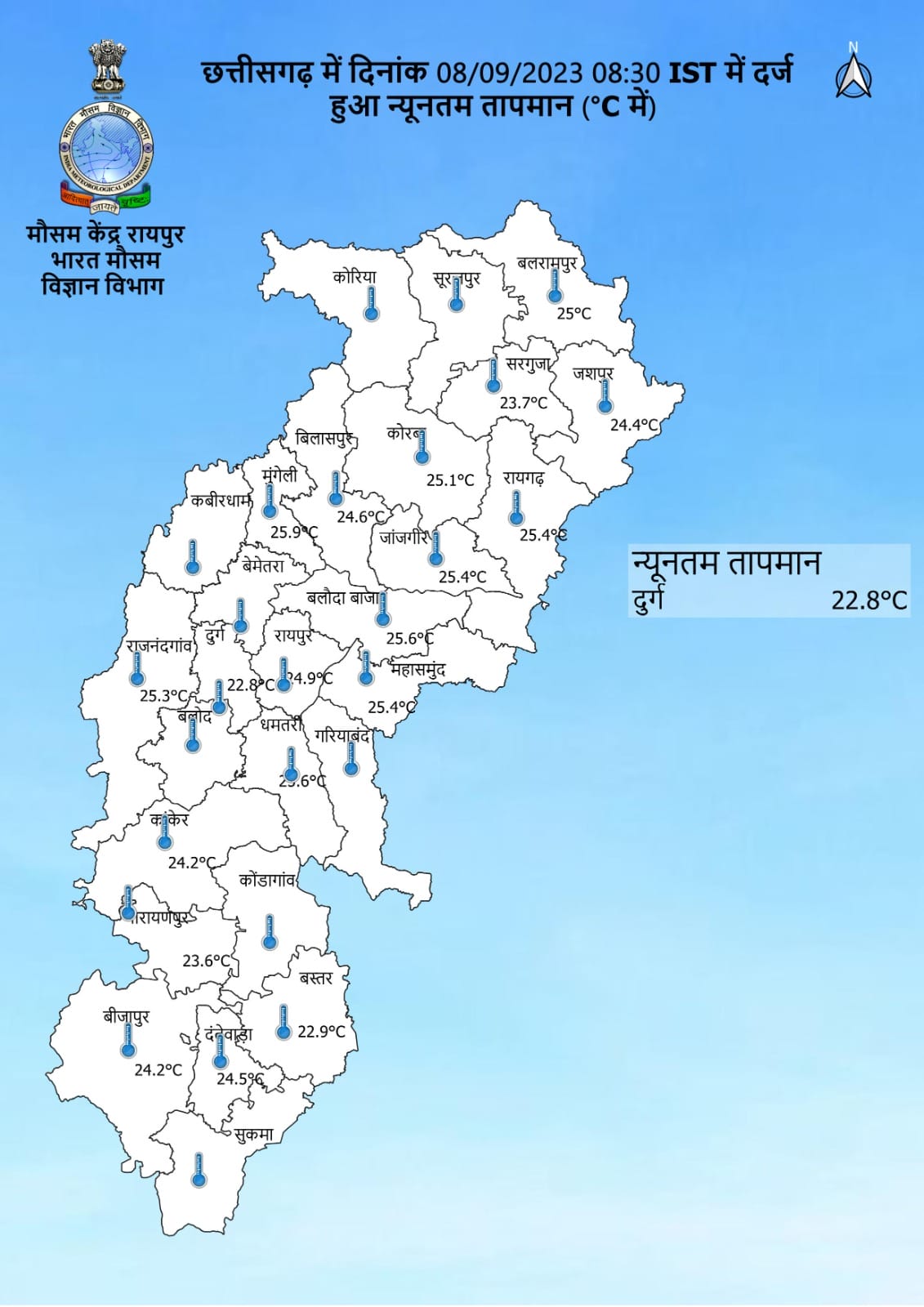 छत्तीसगढ़ मौसम विभाग की मानें तो रायपुर-दुर्ग संभागों में आज भी बारिश के आसार बने हुए है। जिससे दोनों ही संभाग के जिलों में बारिश हो सकती है। सरगुजा संभाग के कुछ जिलों में आज भारी बारिश की संभावना है। बता दे कि प्रदेश में 1 जून से 8 सितम्बर तक 810.2 मिलीलीटर बारिश हो चुकी है, जो सामान्य से 19 फीसदी कम है। राज्य के सुकमा जिले में 20 फीसदी ज्यादा बारिश हुई है।
