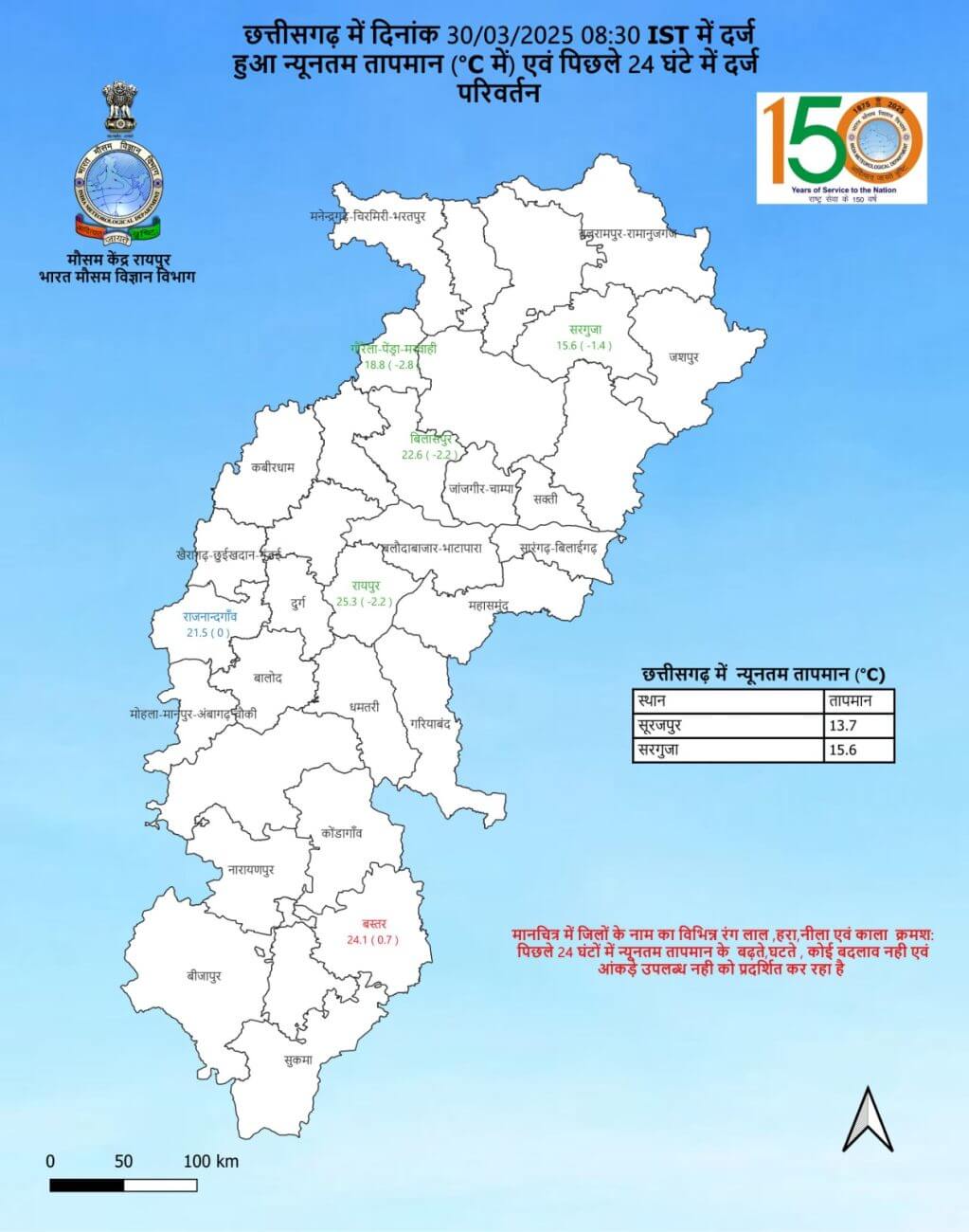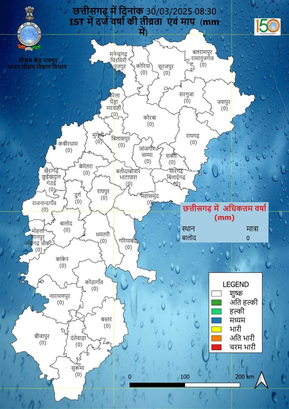 आज रविवार को मध्य छत्तीसगढ़ के कुछ जिलों में गर्म दिन होने की चेतावनी जारी की है।अगले 2 दिनों मेंअधिकतम तापमान मेंकोई दिशेष परिवर्तन होने की संभावना नहीं है, तत्पश्चात आगामी 2 दिनों में 2-3°C की गिरावट होने की संभावना है।मध्य छत्तीसगढ़ में 31 मार्च व 01 अप्रैल को गर्म दिन (HOT DAY) बने रहने की संभावना है।