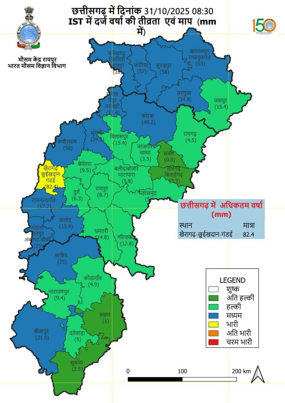 रायपुर मौसम विभाग के मुताबिक, पूर्वी विदर्भ और उससे सटे दक्षिण छत्तीसगढ़ पर बना सुस्पष्ट निम्न दाब का क्षेत्र [तीव्र चक्रवाती तूफान “मोंथा” का अवशेष) पूर्वोत्तर विदर्भ और दक्षिण छत्तीसगढ़ और पूर्वी मध्य प्रदेश के आसपास के क्षेत्रों पर स्थित है। अगले 24 घंटों के दौरान इसके पूर्वी विदर्भ, मध्य प्रदेश और उससे सटे उत्तरी छत्तीसगढ़ में लगभग उत्तर की ओर बढ़ने और कमजोर होकर निम्न दबाव के क्षेत्र में तब्दील होने की संभावना है।आज शुक्रवार को प्रदेश में कुछ स्थानों पर हल्की से मध्यम वर्षा और एक-दो स्थानों पर मेघगर्जन होने की संभावना है। 2 दिनों के बाद प्रदेश में कुछ स्थानों पर हल्की से मध्यम वर्षा होने की संभावना है।