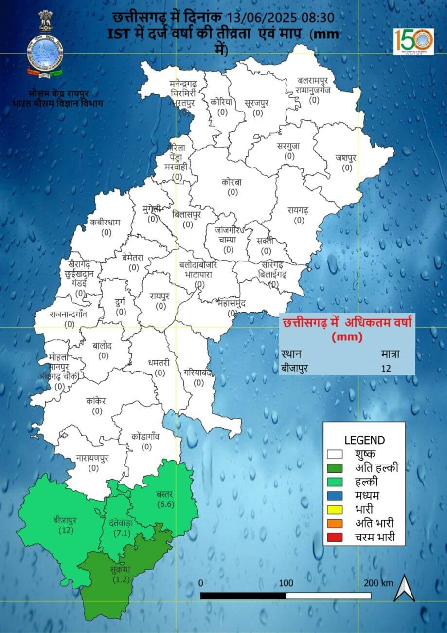 Chhattisgarh Weather: छत्तीसगढ़ में 14 जून से मानसून के फिर सक्रिय होने की संभावना है।इसके असर से पूरे प्रदेश में अनेक स्थानों पर मध्यम वर्षा के साथ कुछ भारी वर्षा की गतिविधियां शुरू होंगी। फिलहाल 2 दिन दक्षिण छत्तीसगढ़ में मेघ गर्जन के साथ वज्रपात, तेज हवा और वर्षा की गतिविधियां जारी रहेगी।