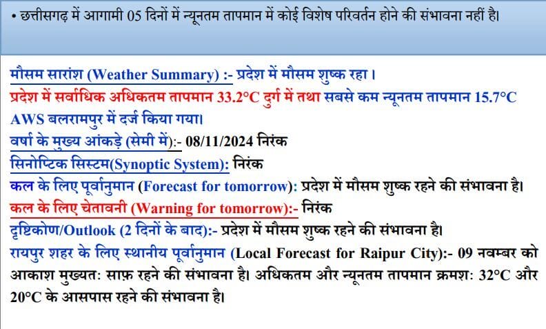 Chhattisgarh Weather Update Today : नवंबर का महीना जैसे जैसे आगे बढ़ रहा है, वैसे वैसे छत्तीसगढ़ के मौसम में बदलाव देखने को मिल रहा है। प्रदेश में आगामी पांच दिनों में न्यूनतम और अधिकतम तापमान में बदलाव की संभावना नहीं है, ऐसे में मौसम शुष्क रहने कि संभावना है।इसके बाद तापमान में गिरावट आने से ठंड में इजाफा होगा।
