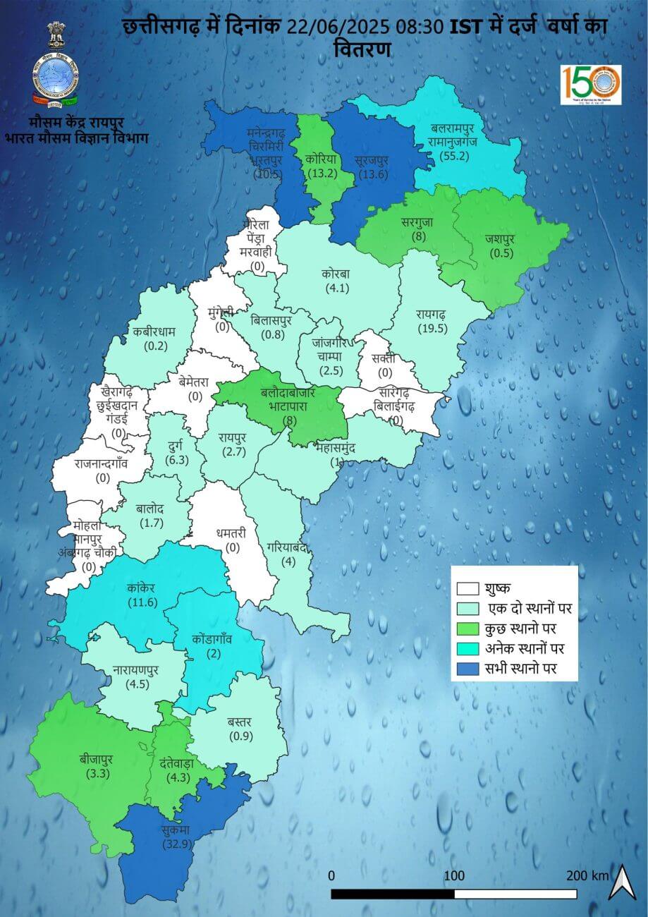 - रायपुर जिले में 38.6 मि.मी. बलौदाबाजार में 41.9 मि.मी., गरियाबंद में 47.5 मि.मी., महासमुंद में 30.4 मि.मी. और धमतरी में 24.1 मि.मी. औसत वर्षा दर्ज हुई है। बिलासपुर में 23.1 मि.मी।मुंगेली में 14.8 मि.मी. रायगढ़ में 112.7 मि.मी., सारंगढ़ बिलाईगढ़ में 40.6 मि.मी., जांजगीर-चांपा में 42.5 मि.मी., सक्ती में 47.6 मि.मी. कोरबा में 63.9 मि.मी. और गौरेला-पेण्ड्रा-मरवाही 49.6 मि.मी. औसत वर्षा रिकार्ड हुई है।