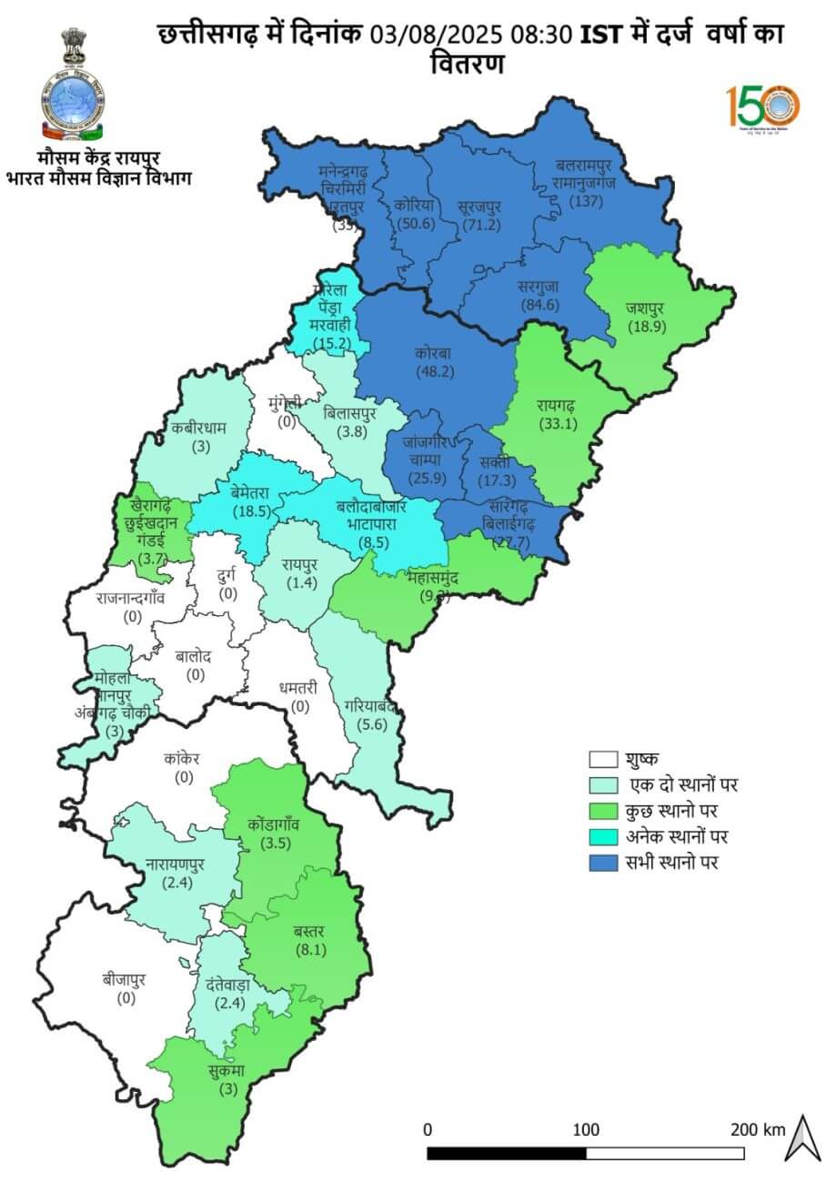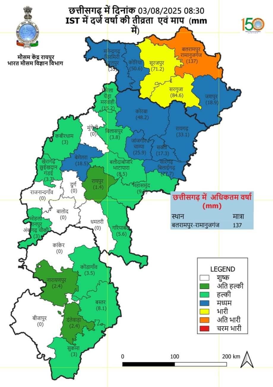 - रायपुर संभाग में रायपुर जिले में 581.0 मि.मी., बलौदाबाजार में 555.9 मि.मी., गरियाबंद में 496.9 मि.मी., महासमुंद में 538.1 मि.मी. और धमतरी में 498.8 मि.मी. औसत वर्षा दर्ज हुई है।