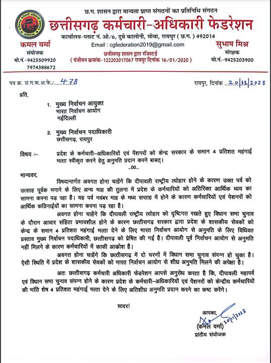 छत्तीसगढ़ कर्मचारी-अधिकारी फेडरेशन ने निर्वाचन आयोग को एक पत्र लिखा है,जिसमें उन्होंने कहा है कि छत्तीसगढ़ में दो चरणों में विधानसभा चुनाव संपन्न हो चुका है। ऐसी स्थिति में प्रदेश के शासकीय सेवकों को भारत निर्वाचन आयोग से शीघ्र अनुमति मिलने की अपेक्षा है।अतः छत्तीसगढ़ कर्मचारी अधिकारी फेडरेशन आपसे अनुरोध करता है कि दीपावली महापर्व और विधानसभा चुनाव संपन्न होने के कारण प्रदेश के कर्मचारी-अधिकारियों और पेंशनरों को केन्द्रीय कर्मचारियों की भांति शेष 4 प्रतिशत महंगाई भत्ता देने के लिए अतिशीघ्र अनुमति प्रदान करने का कष्ट करेंगे।