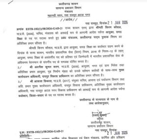 छत्तीसगढ़ में प्रशासनिक फेरबदल करते हुए 3 आईएएस (भारतीय प्रशासनिक सेवा) अधिकारियों को नई जिम्मेदारी सौंपी है। 21 जनवरी 2026 को सामान्य प्रशासन विभाग, छत्तीसगढ़ शासन ने इस संबंध में आदेश जारी किए हैं। इसमें 1 आईएएस का तबादला किया गया है जबकि 2 को अतिरिक्त प्रभार सौंपा गया है। इन अधिकारियों में आईएएस आकाश छिकारा, आईएएस अवनीश कुमार शरण और आईएएस किरण कौशल का नाम शामिल है।