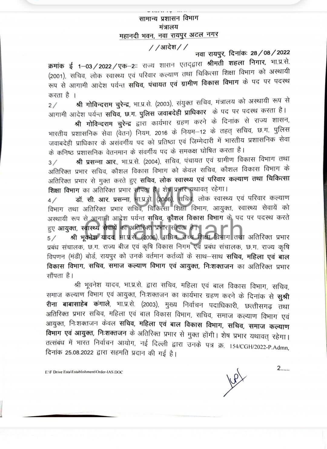 - 2004 बैच के अफसर प्रसन्ना आर. को स्वास्थ्य, परिवार कल्याण और चिकित्सा शिक्षा विभाग के सचिव की अतिरिक्त जिम्मेदारी दी है। प्रसन्ना वर्तमान में पंचायत एवं ग्रामीण विकास विभाग के साथ कौशल विकास विभाग के सचिव है।।