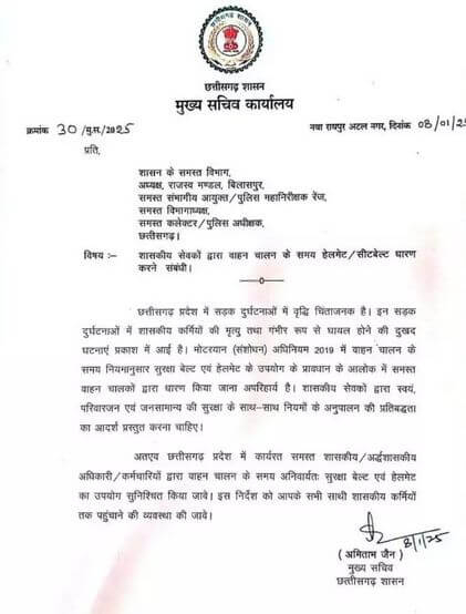 - इस संबंध में मुख्य सचिव अमिताभ जैन ने राज्य शासन के समस्त विभागों, विभागाध्यक्ष, अध्यक्ष राजस्व मंडल बिलासपुर, सभी संभागायुक्त, पुलिस महानिरीक्षक रेंज, समस्त कलेक्टर और पुलिस अधिक्षकों को अपने अधिनस्त सभी शासकीय कर्मियों को सुरक्षा बेल्ट एवं हेलमेट का उपयोग सुनिश्चित करने कहा है।