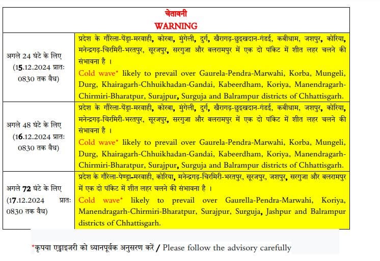 छत्तीसगढ़ मौसम विभाग के अनुसार, 14-15 दिसंबर से प्रदेश में दिन और रात के तापमान में गिरावट होगी। उत्तर से आ रही हवाओं के चलते 15 से 17 दिसंबर तक कोरबा, सूरजपुर, बलरामपुर, मुंगेली, गौरेला-पेण्ड्रा-मरवाही, मनेन्द्रगढ़-चिरमिरी-भरतपुर, खैरगढ़-छुईखिंदी-गंडई और जगदलपुर जिलों में शीतलहर की संभावना है।शीतलहर को देखते हुए कुछ जिलों में स्कूलों के समय में बदलाव किया गया है, आने वाले दिनों अन्य स्कूलों के समय भी परिवर्तन देखने को मिल सकता है।