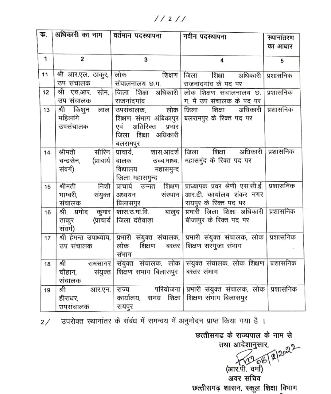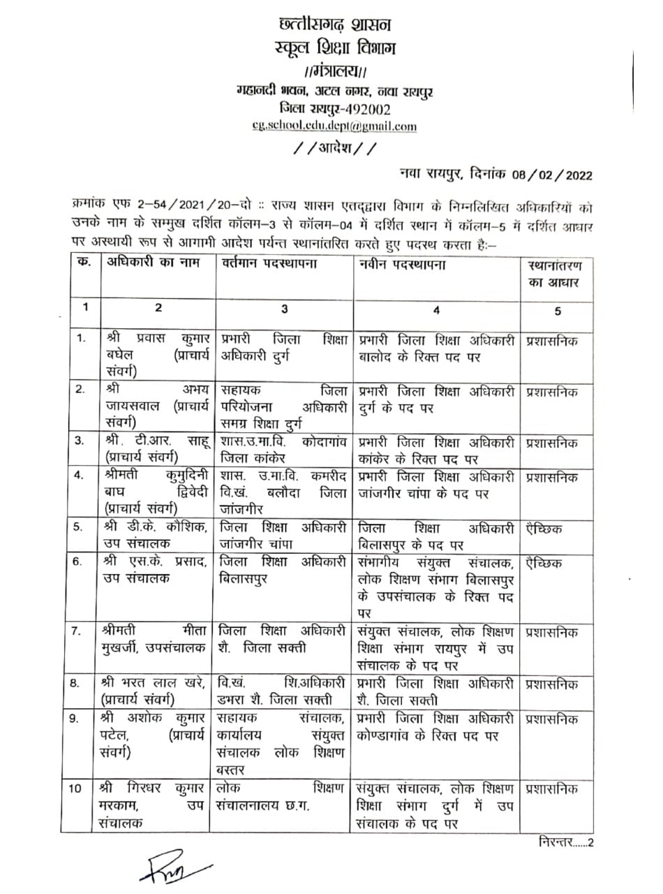 रायपुर, डेस्क रिपोर्ट। नए साल 2022 में छत्तीसगढ़ (Chhattisgarh Transfer) में तबादलों का दौर जारी है। अब राज्य शासन (CG Government) ने स्कूल शिक्षा विभाग (CG School Education Department) के 19 अधिकारियों के तबादले किए है।इस संबंध में स्कूल शिक्षा विभाग मंत्रालय द्वारा आदेश जारी किए गए है।