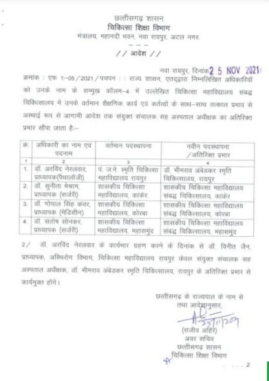 रायपुर, डेस्क रिपोर्ट। छत्तीसगढ़ राज्य के सबसे बड़े सरकारी अस्पताल मेकाहारा के अधीक्षक हटाए गए, डॉक्टर अरविंद को अधीक्षक बनाया गया है, डॉक्टर विनीत जैन की जगह अरविंद निर्माण को यह कमान सौंपी गई है, वही कोरबा, महासमुंद, कांकेर के अधीक्षक भी बदले गए है, देर शाम चिकित्सा शिक्षा विभाग मंत्रालय से यह आदेश जारी हुआ, आदेश अवर सचिव छत्तीसगढ़ राजीव अहीरे शासन चिकित्सा शिक्षा विभाग ने जारी किया है।