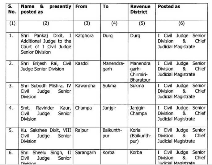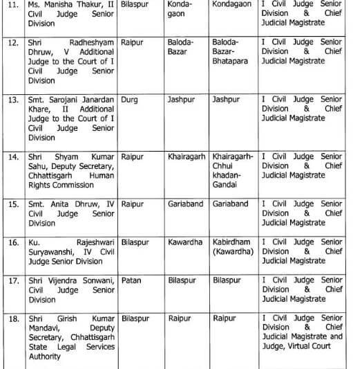 रायगढ़ के डिस्ट्रिक्ट एंड एडिशनल सेशन जज संतोष कुमार आदित्य को बिलासपुर जुडिशल ऑफिसर ट्रेनिंग इंस्टिट्यूट का डायरेक्टर बनाया गया हैं। जुडिशल ऑफिसर ट्रेनिंग इंस्टिट्यूट के डायरेक्टर सिराजुद्दीन कुरैशी को बिलासपुर का प्रधान जिला एवं सत्र न्यायाधीश बनाया गया है।