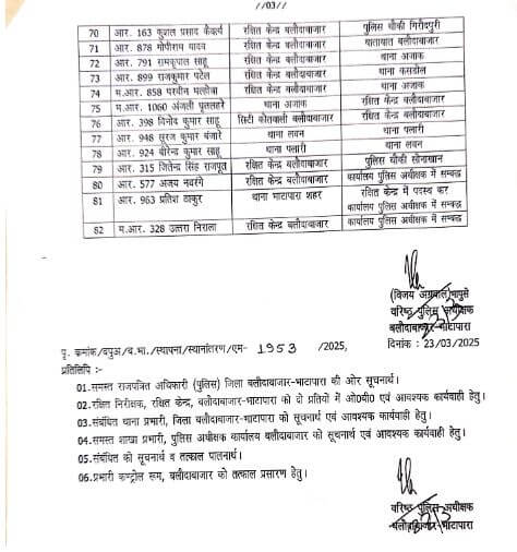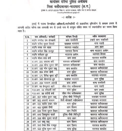 CG Police Transfer : छत्तीसगढ़ के बलौदाबाजार जिले के पुलिस महकमे में एक बार फिर बड़ा फेरबदल हुआ है। एसएसपी विजय अग्रवाल ने निरीक्षक, एएसआई, हेड कांस्टेबल समेत 86 पुलिसकर्मियों को इधर से उधर किया गया है।इस संबंध में 2 अलग अलग आदेश जारी किए गए है।