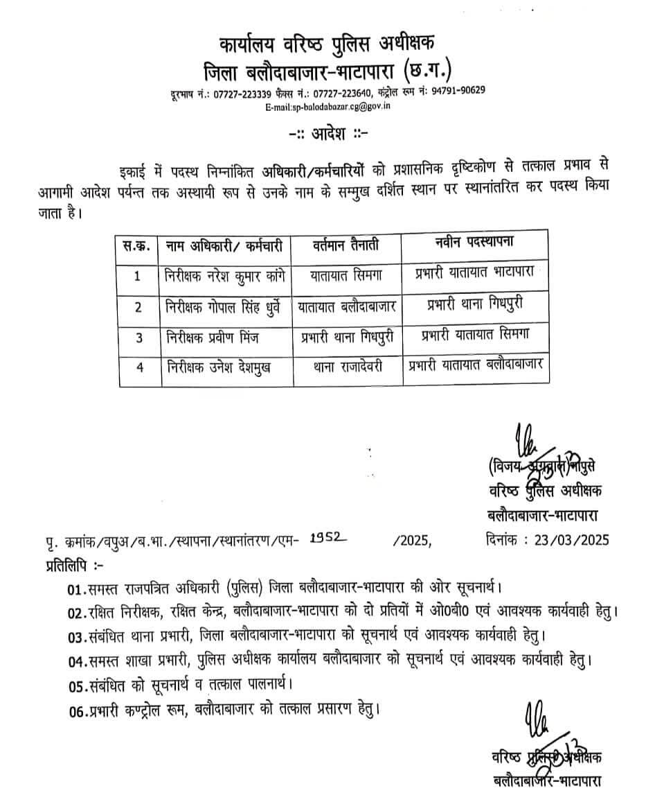 इस तबादले में यातायात विभाग के तीन प्रभारी भी बदले गए हैं, जिनमें सिमगा, भाटापारा और बलौदा बाजार के प्रभारी शामिल हैं। सिमगा थाना प्रभारी नरेश कुमार कांगे को भाटापारा ,गोपाल सिंह धुर्वें को यातायात से गिधपुरी, प्रवीण मिंज को यातायात सिमगा और उनेश देशमुख को राजदेवरी से यातायात थाना बलौदाबाजार का प्रभारी बनाया गया है।